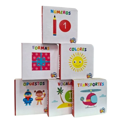 Cada libro aborda temas fundamentales para el desarrollo infantil: - Vocales - Opuestos - Formas - Transportes - Colores - Números