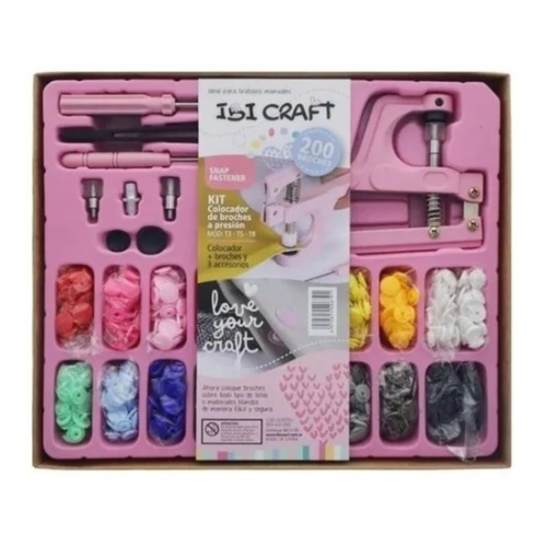 Este set de la marca Ibi Craft incluye un colocador de broches a presión en un atractivo color rosa. El modelo es compatible con los tamaños T3, T5 y T8. Además, el set incluye 200 broches y 3 accesorios adicionales.